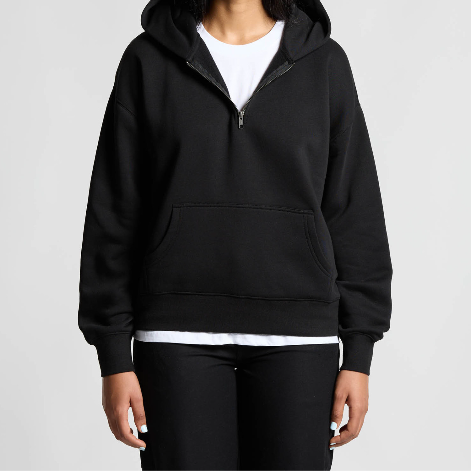 Pullover hood, drop shoulder, kangaroo pocket, zip at front placket,